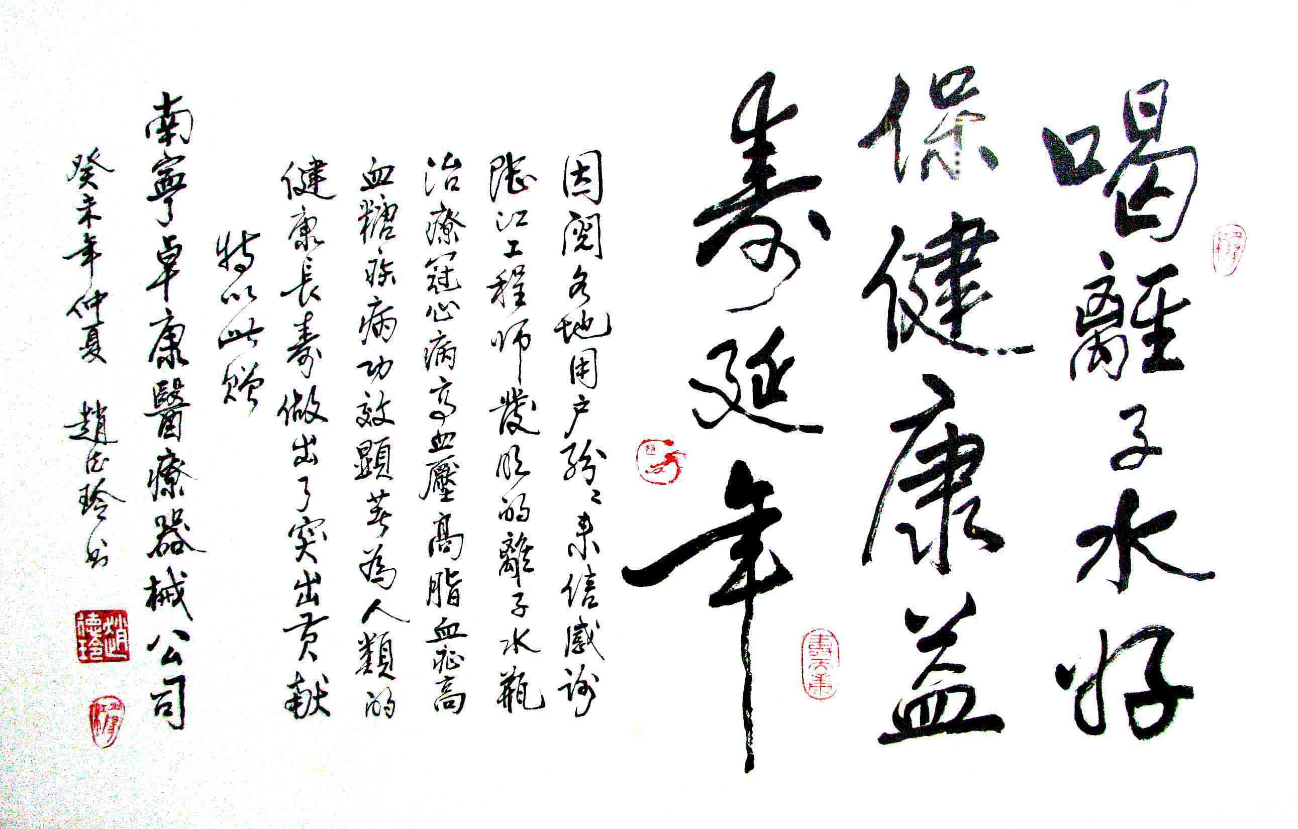 ---本品處理水用核磁共振測定值為55.82Hz(赫茲),為富含4-6個水分子小簇團的微小分子團水,可與世界各地長壽村水媲美。本品曾經(jīng)三家省級醫(yī)院做臨床觀察,經(jīng)北京和廣西醫(yī)學專家鑒定,22年來對以上病癥承諾療效,大量原發(fā)性高血壓患者飲用4至6個月內(nèi)停藥,血壓正常穩(wěn)定,癥狀消除,逐漸逆轉(zhuǎn)至消除動脈粥樣硬化;冠心病患者在3至5個月內(nèi)逐漸減輕至消除心痛胸悶,一年左右痊愈,心腦電圖正常。這是根據(jù)中國基礎醫(yī)學研究成果和生命科學原理轉(zhuǎn)化為醫(yī)學應用的杰出成果,使人從細胞到器官發(fā)展至全身健康。2型糖尿病患者使用3-10月內(nèi)痊愈。中風后遺癥患者7-10個月改善至消除肢體和語言障礙。用戶最新報告:尿毒癥患者飲用兩個月,指標已經(jīng)大為改善,適合腎衰和透析者使用。以上均為史無前例的轉(zhuǎn)化醫(yī)學應用,產(chǎn)品壽命30年,不換芯。