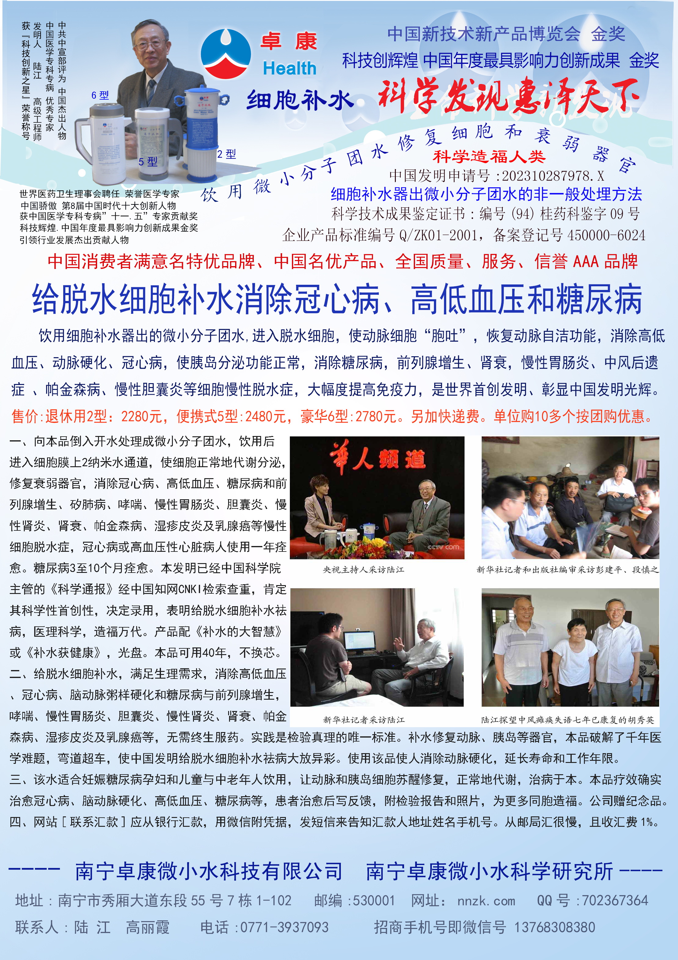 人類幾千年來患以上病癥需終生服藥,幾十年也不能治愈。可是我國南寧的高級工程師陸 江,于1990年想根治高血壓,研究發(fā)明了離子水瓶,處理出微小分子團水供飲用,經(jīng)過醫(yī)院臨床試用和專家鑒定,1999年獲中國發(fā)明專利權(quán),產(chǎn)品于2000年投放市場后一直跟蹤調(diào)查,據(jù)全國各地用戶反饋:祛除了高低血壓、糖尿病和冠心病,并使前列腺增生、咽喉炎、鼻竇炎、慢性氣管炎、支氣管炎、矽肺病、哮喘、慢性胃炎、腸炎、慢性膽囊炎、慢性腎炎、腎衰、膀胱炎、便秘、痔瘡、風濕性關(guān)節(jié)炎和濕疹皮炎及中風后遺癥等病癥不藥而愈。為什么喝微小水能治20多種病?陸 江從1991年德國科學家發(fā)現(xiàn)細胞膜水通道僅為2納米獲得啟發(fā),認為多種器官患病是因細胞脫水,不能正常代謝和分裂增殖,才使器官細胞減少致衰弱萎縮而形成細胞缺水性病癥。22年來的實踐有力地支持了“細胞脫水致病”這一重要論點,表明喝微小水可滿足細胞的生理需求,補水就能祛病,是生命科學新亮點。
